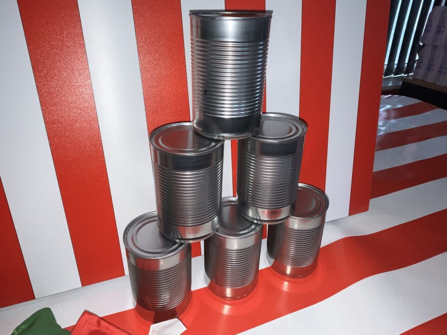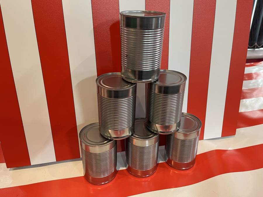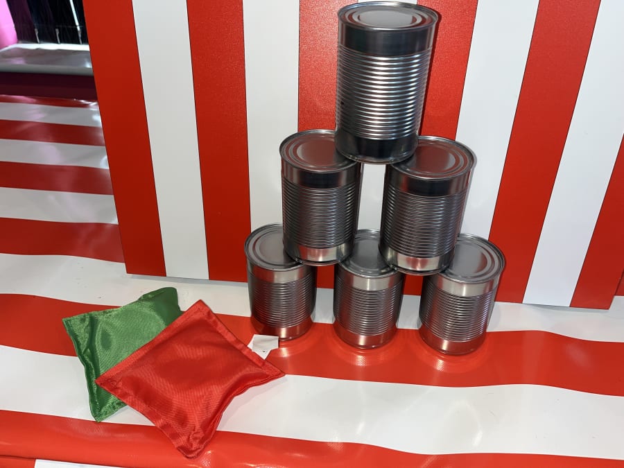 The aim of this funfair game Throw two bean bags or balls at the tin cans to knock them down, all the cans down mean you win the game or a prize depending on how you have set up for the day.
