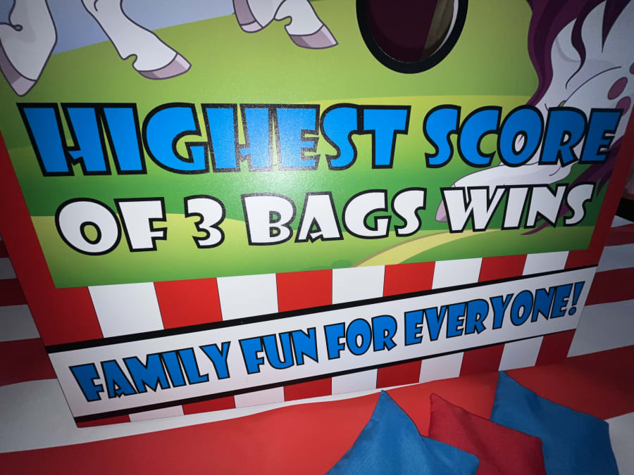 The aim of this funfair game is to throw three bean bags or balls at the different target holes, highest score wins the game or a prize depending on how you have set up for the day.