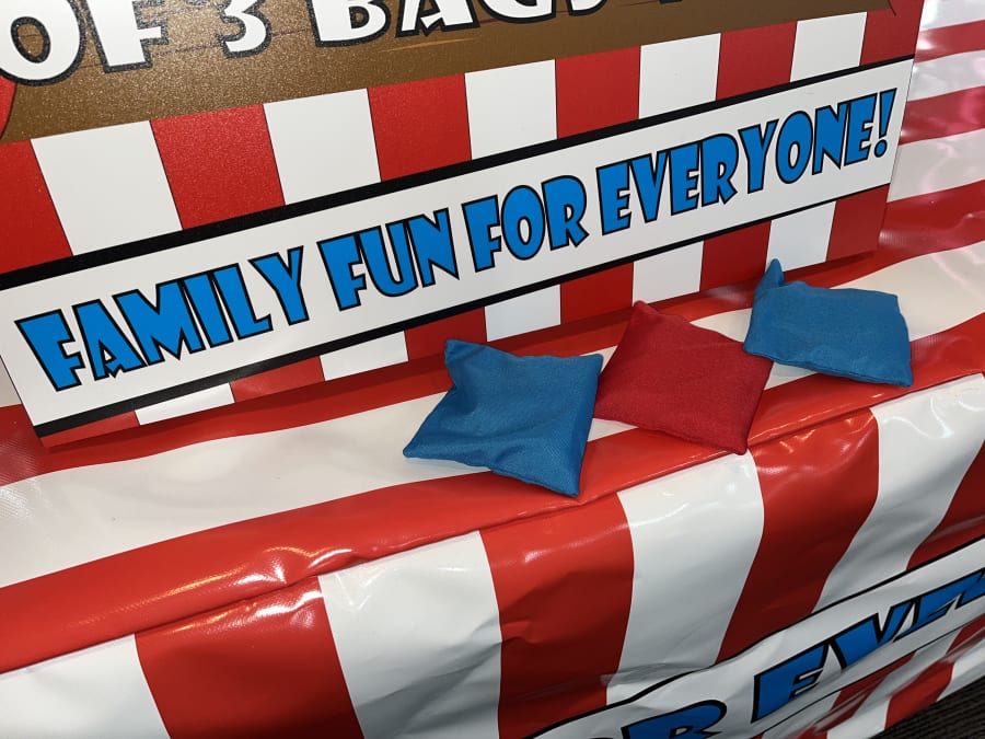 The aim of this funfair game is to throw three bean bags or balls at the different target holes, highest score wins the game or a prize depending on how you have set up for the day.