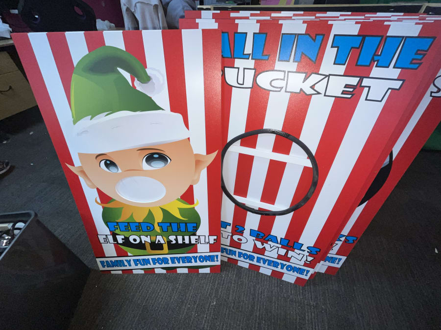The aim of this funfair game is to throw bean bags or balls into the Elfs mouth to fill him up, first to get all three in wins the game or a prize depending on how you have set up for the day.